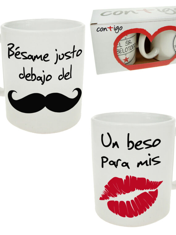 Set de 2 tazas de cerámica con mensaje para enamorados, con el texto “Un beso para mis labios / Bésame justo debajo del bigote”