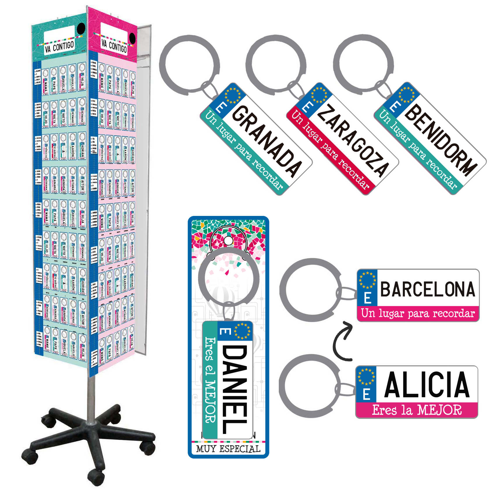 Expositor de llaveros de metal personalizados con diseño de matrícula. La cara frontal de los llaveros lleva el nombre de hombre o mujer, y la cara posterior va personalizada con el nombre de la localidad deseada.