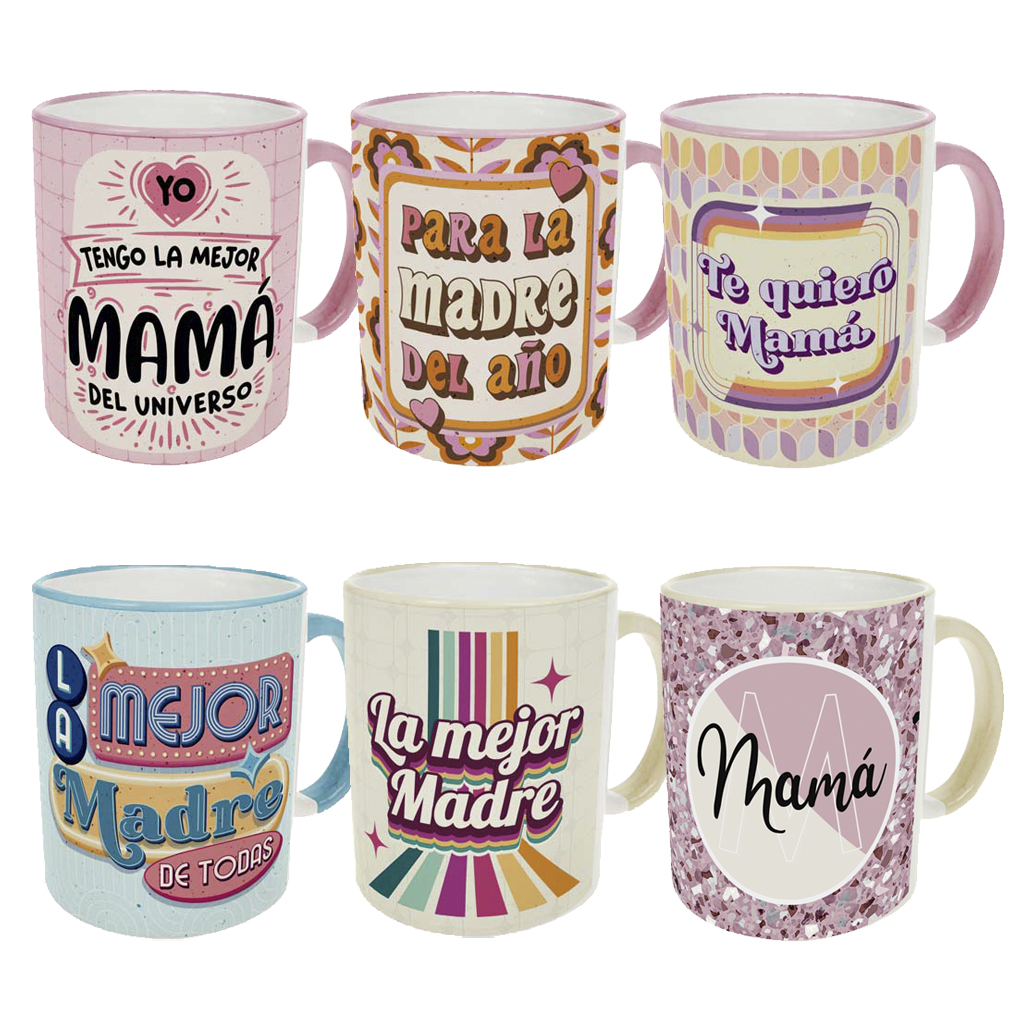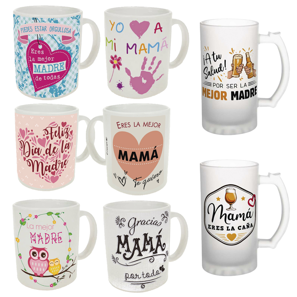 Lote castellano y euskera/castellano: surtido de 48 tazas y 6 jarras de cerveza para el Día de la Madre, con 6 cajitas de jarras de cerveza de regalo.