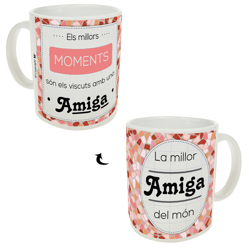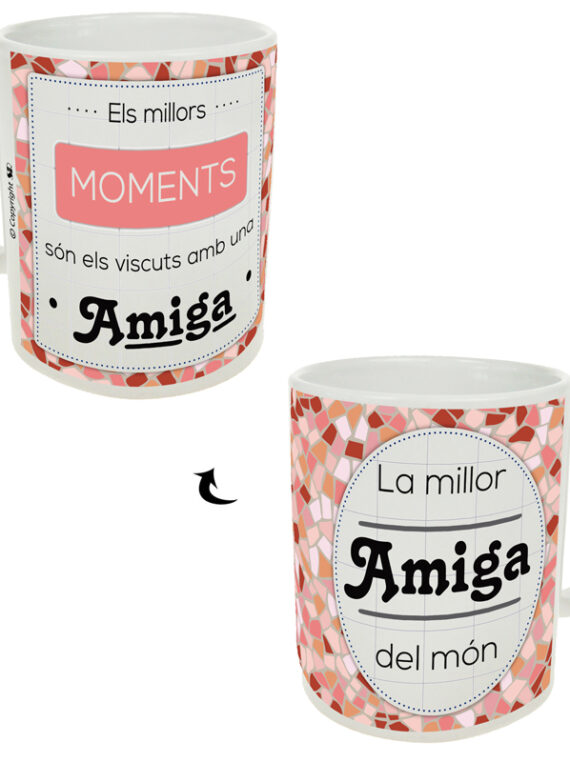 Taza de cerámica con mensaje en catalán, con el texto “La millor amiga del món”