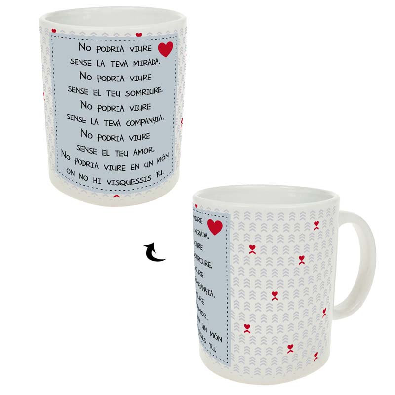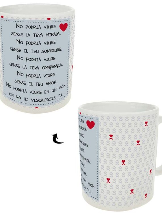 Taza de cerámica con mensaje en catalán, con el texto “No podria viure sense la teva mirada, sense el teu somriure,…”