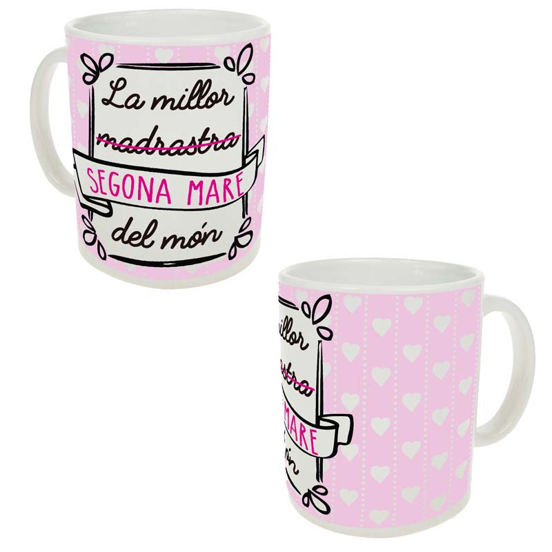 Taza de cerámica con mensaje en catalán, con el texto “La millor (madrastra) segona mare del món”