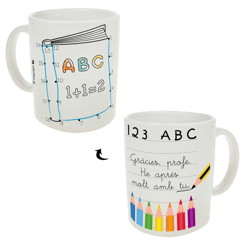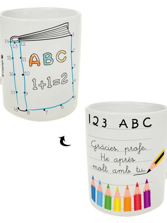 Taza de cerámica con mensaje en catalán, con el texto “Gràcies, profe. He aprés molt amb tu”